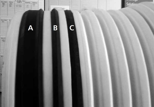 - O-Ring or single-fluted gasket, also known as the “storm sewer” gasket. This is the middle or second gasket from the left, in the pic below. This gasket is associated with quotes for A-2000 Drainage pipe. This gasket is certified to the same ASTM D3212 watertight testing as the double fluted. It to can be used with a compression style connection at a manhole like the double fluted gasket.
