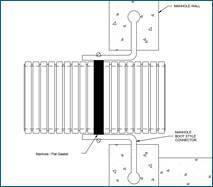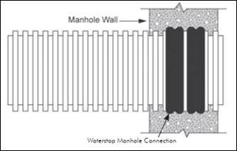 Most storm sewers are simply grouted into a manhole using non-shrink grout and a water-stop gasket, when appropriate. Contech has supplied both the “double fluted” and “single fluted” pipe gaskets for the “water-stop”, which is simply used to help the concrete/grout adhere to something other than the very smooth/slick PVC surface. See gaskets labeled A and B.