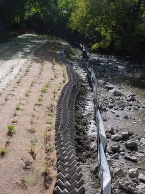 A-Jacks hard armor solutions can be installed either randomly or in a uniform pattern. The voids formed within the A-Jacks matrix provide approximately 40% open space in the uniform placement pattern. These voids provide a habitat for fish and other marine life when applied as a reef, revetment, or soil support system in river applications. In addition, the voids may be backfilled with suitable soils and planted with a variety of vegetation, including grasses, shrubs, and trees above the normal base flow.