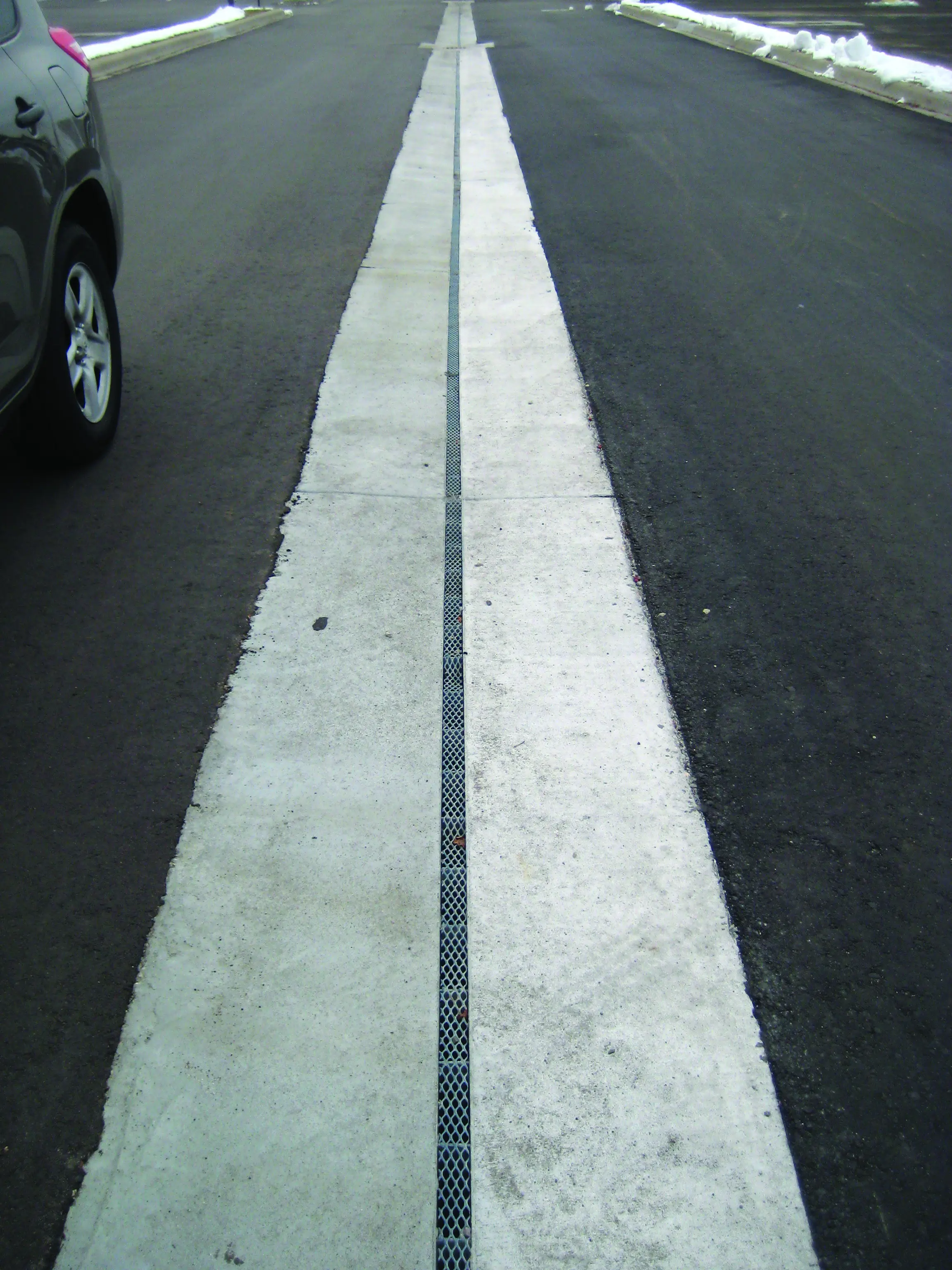 Unlike typical parking lots that require grades to be sloped in four directions for each storm collection grate, a parking lot with slotted drain requires only one transverse and one longitudinal slope for the entire drainage area. That translates to a lower-cost installation for the contractor and owner; and less stake-out for the engineer. Because of Slotted Drain’s efficiency in removing surface water, fewer collectors and fewer laterals under the roadway are needed.