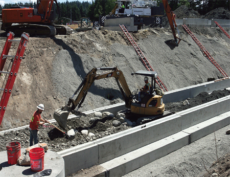 Referring to Figure 4, relatively narrow footings will be controlled by strength. However, from a practical perspective, most spread footings will be wider and thus controlled by settlement. Recall that the DOSI is four times deeper than the footing is wide. The only way to satisfy the settlement limit (Stol) is to reduce the applied stress. The settlement- controlled behavior sets up the important relationship of decreasing factored bearing resistance with increasing footing width. Factored bearing resistance charts provide important information to help clarify the interrelationship between B’f , qr and (Stol). The chart also provides intuitive insight on the most cost-effective footing width as a function of (Stol). Shallow spread footings require significantly less time to excavate and place than deep foundations consisting of drilled or driven piles. Shallow spread footings commonly are constructed using cast-in-place methods. Precast spread footings and newer hybrid systems that combine the installation of speed of precast with the economy of cast-in-place also are available (Photos 1 and 2).
