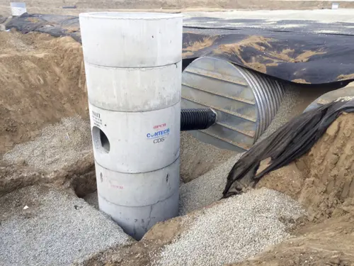 Engineers routinely tie CMP detention systems into storm sewer networks made from a variety of materials, including RCP, HDPE, PVC, and ductile iron, depending on site standards, jurisdictional requirements, and project constraints. The key is ensuring the transition is detailed correctly, including proper structure selection, watertightness (when required), alignment, and constructability. A well-designed connection should support the design flow, avoid becoming an unintended restriction, and remain accessible for inspection and maintenance over the life of the system.