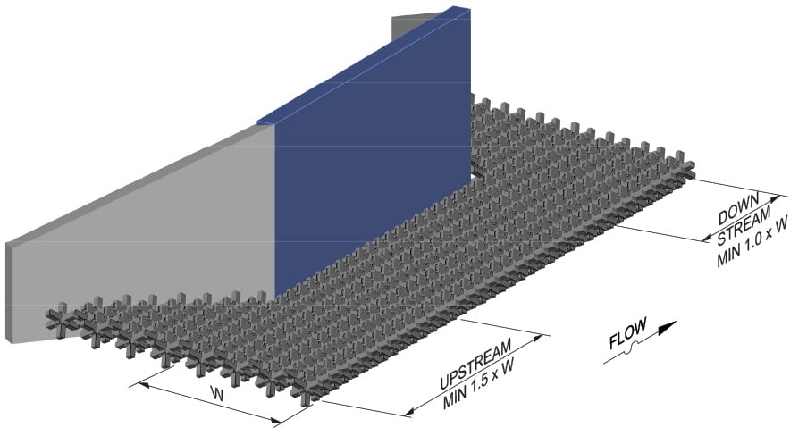 Selecting the right size and understanding the site conditions are essential first steps in the design process. Equally important is how the units are arranged across the riverbed to counteract the ongoing forces of erosion. To provide effective protection for bridge piers and abutments, A-Jacks must extend beyond the anticipated scour limits. Guidance from engineering standards such as HEC-23 for bridge piers and the National Cooperative Highway Research Program Report 587 (NCHRP-587)3 for bridge abutments help establish the necessary coverage area. Additionally, vertical embedment of the units is critical, particularly along the edges of the protected limits, where sediment may be most vulnerable to erosion. This embedment acts as a safeguard against undermining by anchoring the system in place, even if surrounding soils are washed away during high-flow events.