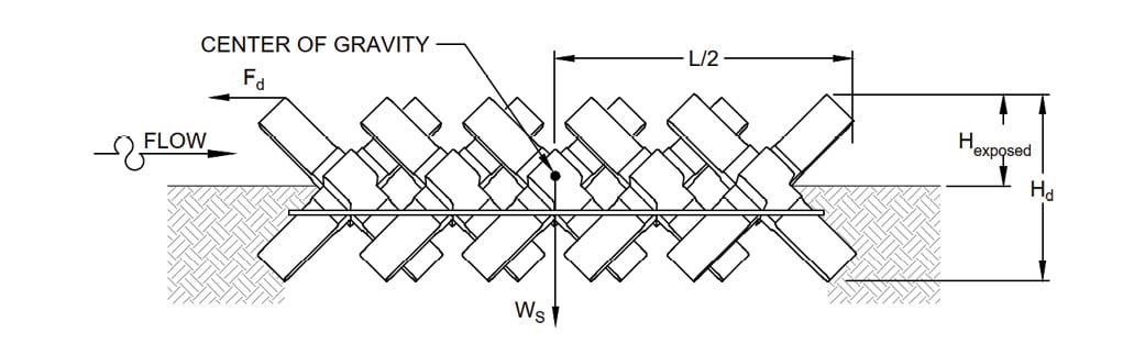 The hydraulic stability of an A-Jacks module is evaluated by weighing the forces trying to move it against the forces anchoring it in place. Specifically, the overturning moment caused by flow-induced drag (Fd) is set equal to the resisting moment, which depends on the module’s submerged weight, Ws, and specific gravity, SG, (see Figure 7 and Equation 1). Larger module sizes, by virtue of their increased weight and broader footprint, naturally provide greater resistance to hydraulic forces, making them more stable in high-energy environments. Additionally, embedment of the units will also provide greater stability since the exposed height (Hexposed) of the unit (as defined in Figure 7) is smaller, further reducing the overturning moment. The drag coefficient, Cd, of 1.05 has been validated through rigorous physical model testing, providing a solid foundation for design calculations.