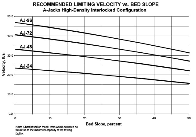Flume testing also has provided insight into the hydraulic thresholds of A-Jack units. Velocity, being one of the most critical parameters in unit sizing, plays a central role in determining stability under flow. Experiments identified a critical velocity based on varying bed slopes at which the units may begin to mobilize. The data from these experiments have been used to create a simple design chart (see Figure 5), which outlines critical velocities for various size units. This provides a practical starting point to select the right unit size for specific site conditions.