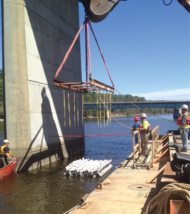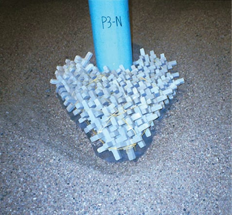 Installation begins with preparing the site to support the interlocking units. Bedding design for A-Jacks installations calls for careful attention to what’s happening beneath the surface. Whether it’s a layer of stone, a geotextile fabric or a combination of both, the goal is the same: to keep native soils in place while allowing the system above to perform as intended. When stone is used as a filter layer, it must be sized and graded to trap underlying sediment, relieve excess pore water pressure and remain stable within the open legs of the A-Jack units. Sometimes, this balance requires multiple layers of stone to meet all the design criteria. Alternatively, a properly selected geotextile fabric can be laid directly on the channel bed, allowing the A-Jack modules to rest securely above without the need for bedding stone. In fast-moving currents, a practical construction technique involves attaching the geotextile directly to the bottom of the modules, streamlining installation and keeping the fabric in place. Design guidance for choosing appropriate geotextile materials is outlined in HEC-23, specifically in Design Guideline 16.