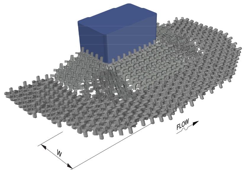 Two key documents stand out to design effective scour countermeasures: HEC-23 and NCHRP-587. The design methodology outlined in HEC-23 approaches the A-Jacks systems as a collection of modular units, often referred to as modules or bundles, to protect bridge piers. These modules are formed by banding together individual A-Jack units into a tightly interlocked matrix, creating a larger structural element that behaves as a unified system (see Figure 6). By adjusting the number of units within a module, engineers can customize both the length (L) and width (B) of the module to accommodate specific hydraulic and geometric conditions.