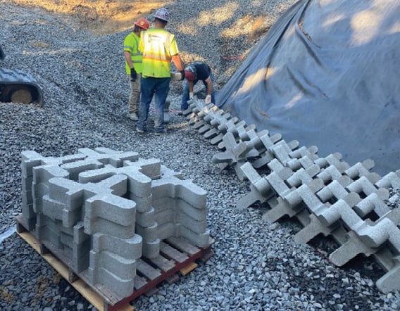The openings formed between the units in the A-Jacks matrix provide approximately 40 percent void space in a uniform placement pattern. These voids not only allow for water conveyance and sediment deposition but also create habitats that support fish and other aquatic life, contributing ecological value to the hydraulic function. These units are not just about form and function beneath the surface; they’re also engineered for practicality in the field. Even the smallest of these units carries weight. A 24-inch A-Jack unit weighs about 80 pounds, light enough to be handled by a crew of laborers without the aid of heavy machinery. But how do you move a unit like that efficiently? Each unit is shipped in two interlocking halves, neatly palletized for transport (see Figure 3). Once onsite, these halves are assembled into full units by hand and placed directly onto the streambed, even in conditions where water is already flowing.