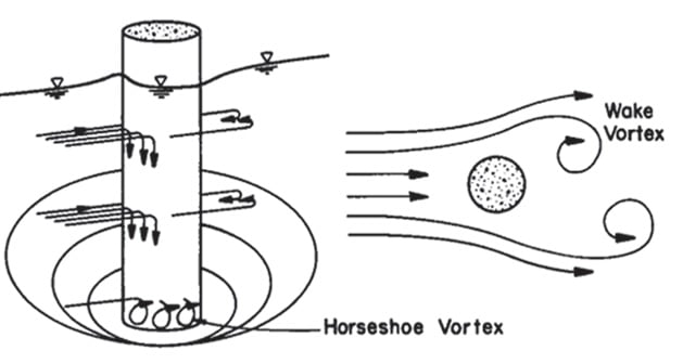 Bridge abutments and piers often stand at the front lines of hydraulic forces, where swift, turbulent flows put them at constant risk of scour-related failure. The velocity of water near these structures is anything but uniform—it fluctuates wildly. As flow approaches a solid object such as a pier or abutment, it separates and accelerates around the edges, forming zones of high velocity and swirling vortices, spinning like invisible tornadoes that dig deep into the riverbed (see Figure 1). These concentrated vortices amplify erosive forces, removing soil and threatening the stability of the foundation. The risk is further compounded by the surrounding geometry. Steep channel slopes elevate flow energy, while abrupt transitions or constrictions, often introduced by bridge features, intensify turbulence. The convergence of flow dynamics creates a perfect storm of destructive energy at the very locations where structural integrity is most critical.