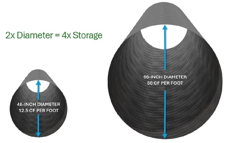As shown in Figure 2, increasing the diameter of the pipe from 48 inches to 96 inches increases the volume per linear foot by a factor of four. This not only increases storage but also reduces the number of pipes, joints and fittings, lowering installation and material costs.